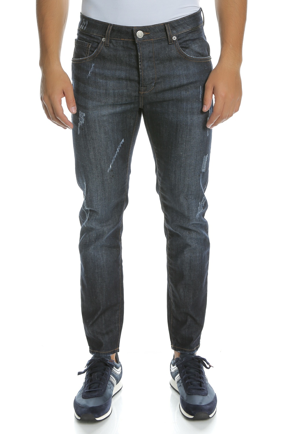 Ανδρικό τζιν παντελόνι σε μπλε απόχρωση, ίσια γραμμή που στενεύει προς τα κάτω, μήκος στο αστράγαλο και τσέπες μπροστά και πίσω.
