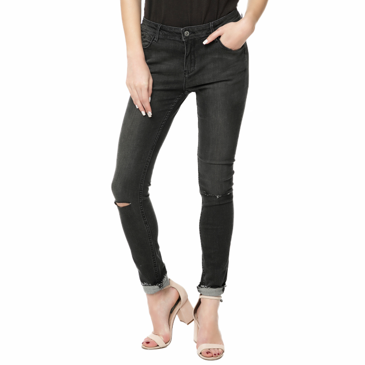 Γυναικείο τζιν σε μαύρη απόχρωση με σκισίματα, διακριτικά ξεβάμματα και skinny γραμμή. Συνδυάστε το με ψηλοτάκουνες γόβες για σούπερ θηλυκές εμφανίσεις!