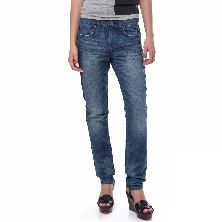 Βαμβακερό ψηλόμεσο τζιν παντελόνι με στενή γραμμή σε μπλε χρώμα, διακριτικά ξεβάμματα και τσέπες στο μπροστινό και πίσω μέρος.