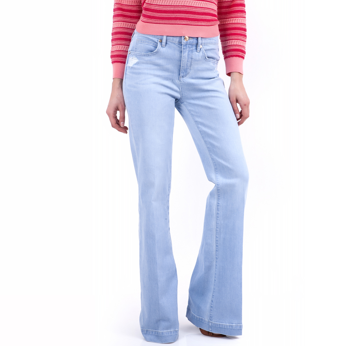Βαμβακερό ψηλόμεσο τζιν παντελόνι σε μπλε ανοιχτό χρώμα, με skinny γραμμή στο πάνω μέρος και άνοιγμα καμπάνα στο κάτω. Το διαχρονικό σχέδιο επέστρεψε δυναμικά στη μόδα και πρέπει να το αποκτήσετε.