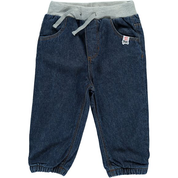Βρεφικό τζιν παντελόνι για αγόρια σε σκούρο μπλε χρώμα με λάστιχο στο ύψος των αστράγαλων. Διαθέτει επίσης λάστιχο και κορδόνι στην μέση αλλά σε γκρι χρώμα, και μια υπεροχή μικρή ραμμένη λεπτομέρεια στην μπροστά αριστερή τσέπη