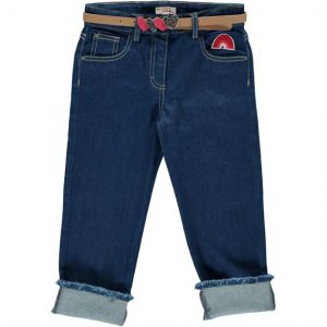 Ένα κλασσικό αλλά με μοντέρνες πινελιές σκούρο τζιν για κορίτσια. Έχει μπροστινές τσέπες, κλείνει με κουμπί και συνδυάζεται με καφέ ανοιχτή ζώνη, με 3d καρδιές με glitter. Οι πίσω τσέπες είναι σχεδιασμένες σε σχήμα καρδιάς, ενώ στο μπροστινό μέρος, υπάρχει ένα διακριτικό ουράνιο τόξο.