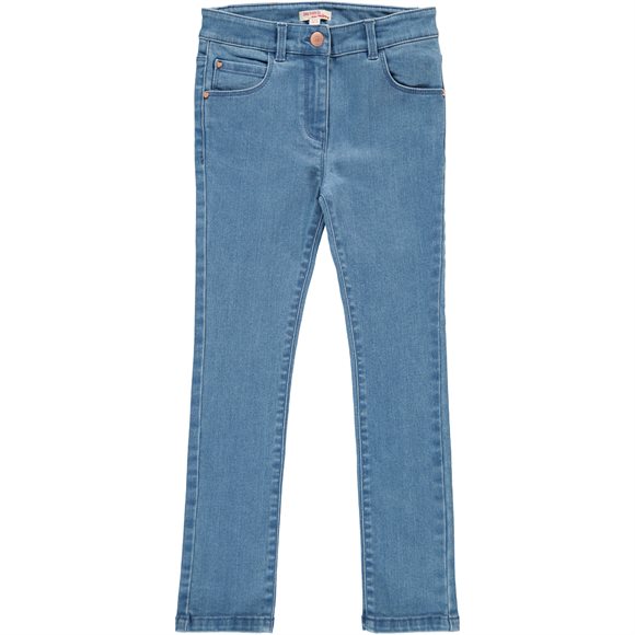 Παιδικό τζιν παντελόνι για κορίτσια, με στρετς ύφασμα και πολύ όμορφες, διακριτικές και πρωτότυπες λεπτομέρειες στο κουμπί στην μέση και στα φινιρίσματα στα πριτσίνια