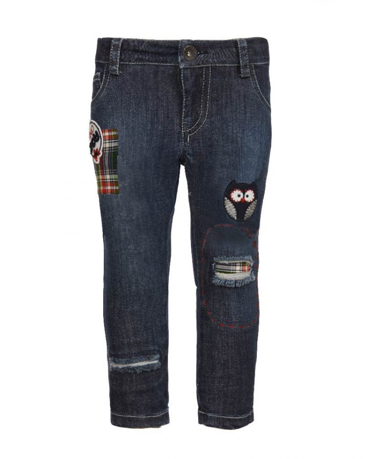 Παιδικό παντελόνι πεντάτσεπο σε μπλέ σκούρο χρώμα, από τζην ελαστικό ύφασμα, διακοσμημένο με μπαλώματα και έντονα σκισίματα, με λάστιχο αυξομείωσης εσωτερικά στην μέση.