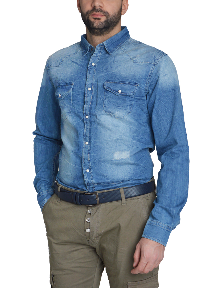Ανδρικό jean πουκάμισο. Σε κανονική γραμμή.Διατίθεται σε ανοιχτό μπλε χρώμα με διακριτικά ξεβάμματα. -Χρώμα: Μπλε -Σύνθεση: 100% cotton -Συλλογή: Άνοιξη-Καλοκαίρι