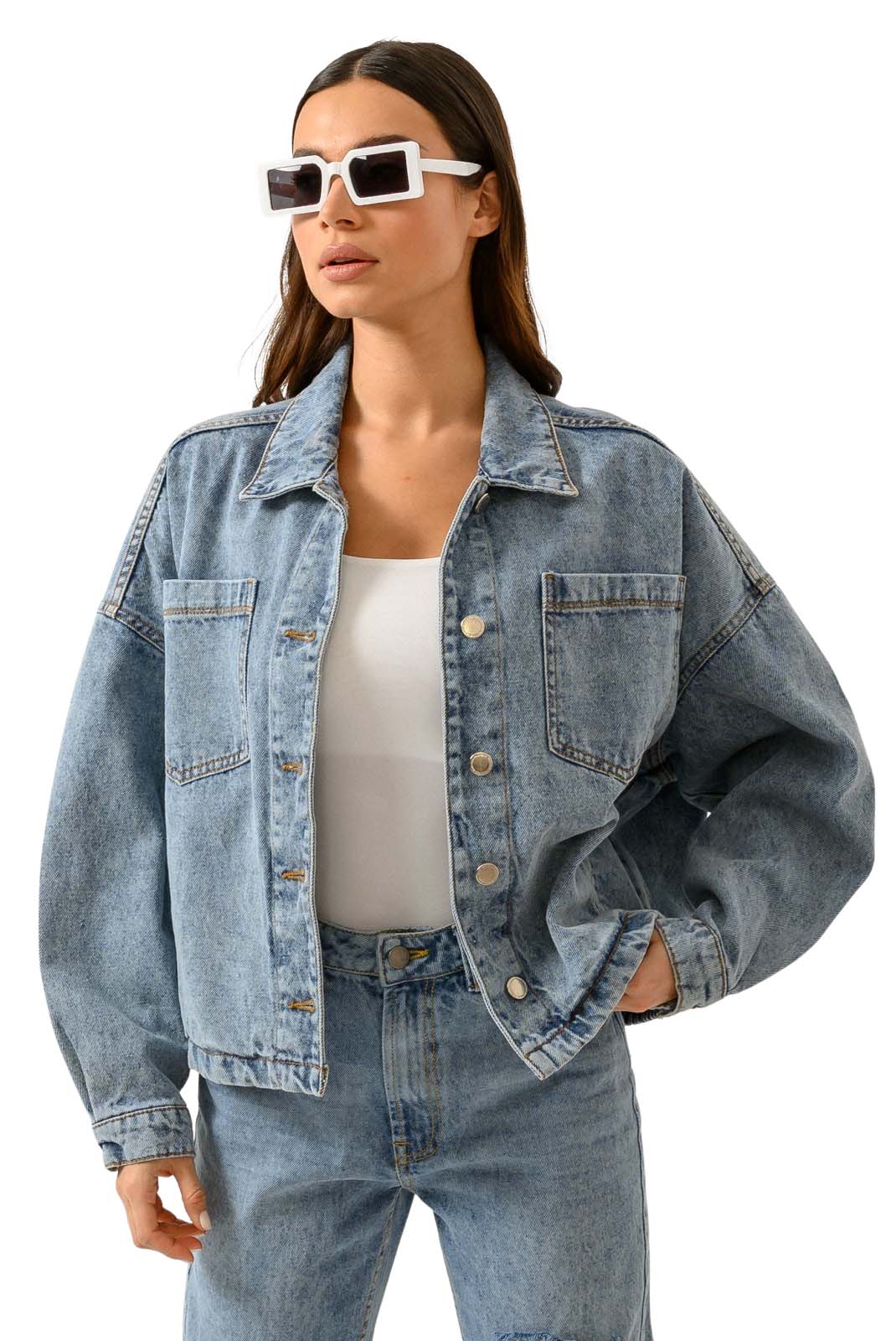Ντένιμ τζάκετ με γιακά και τσέπες στο μπροστινό μέρος. Λάστιχο στο πίσω μέρος της μέσης και κλείσιμο μπροστά με κουμπιά. Χαλαρή εφαρμογή. Μέγεθος μοντέλου: S-M
