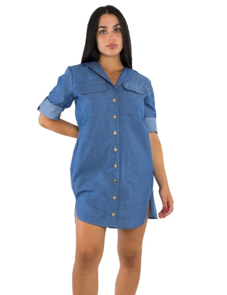 Γυναικείο τζιν, μονόχρωμο πουκαμισοφόρεμα με κουμπιά, τσεπάκια στο στήθος και στο πλάι . Το υφασμά του σταθερό δεν διαθέτει ελαστικότητα. Κανονική προς άνετη εφαρμογή Σύνθεση: 100% cotton Το μοντέλο έχει ύψος 1.67 και 60 κιλά. Φοράει μέγεθος one size .