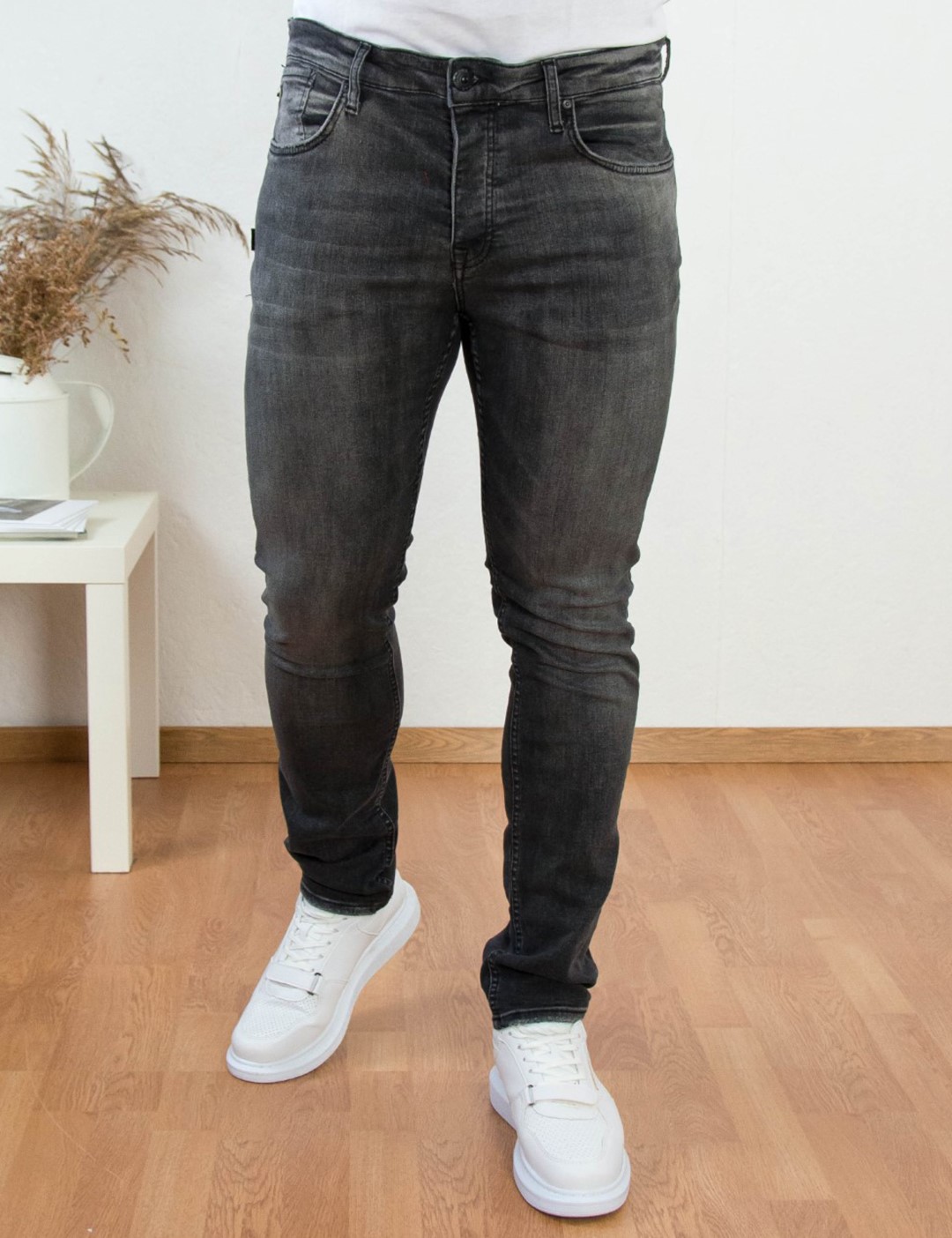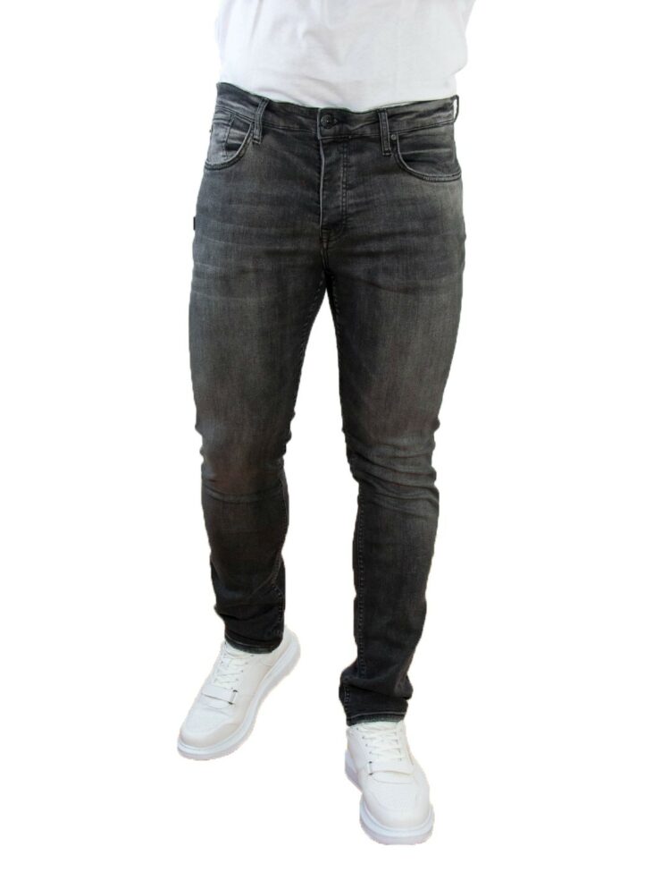 Ανδρικό τζιν παντελόνι σε γκρι χρώμα με ξέβαμμα. Είναι πεντάτσεπο και κλείνει με κουμπιά. Διαθέτει δερμάτινο λογότυπο της εταιρείας στο πίσω μέρος. Κανονική εφαρμογή Διαθέτει ελαστικότητα Σύνθεση: 98% cotton, 2% lycra Το μοντέλο έχει ύψος 1.85 και 90 κιλά. Φοράει 34 νούμερο.