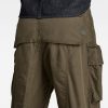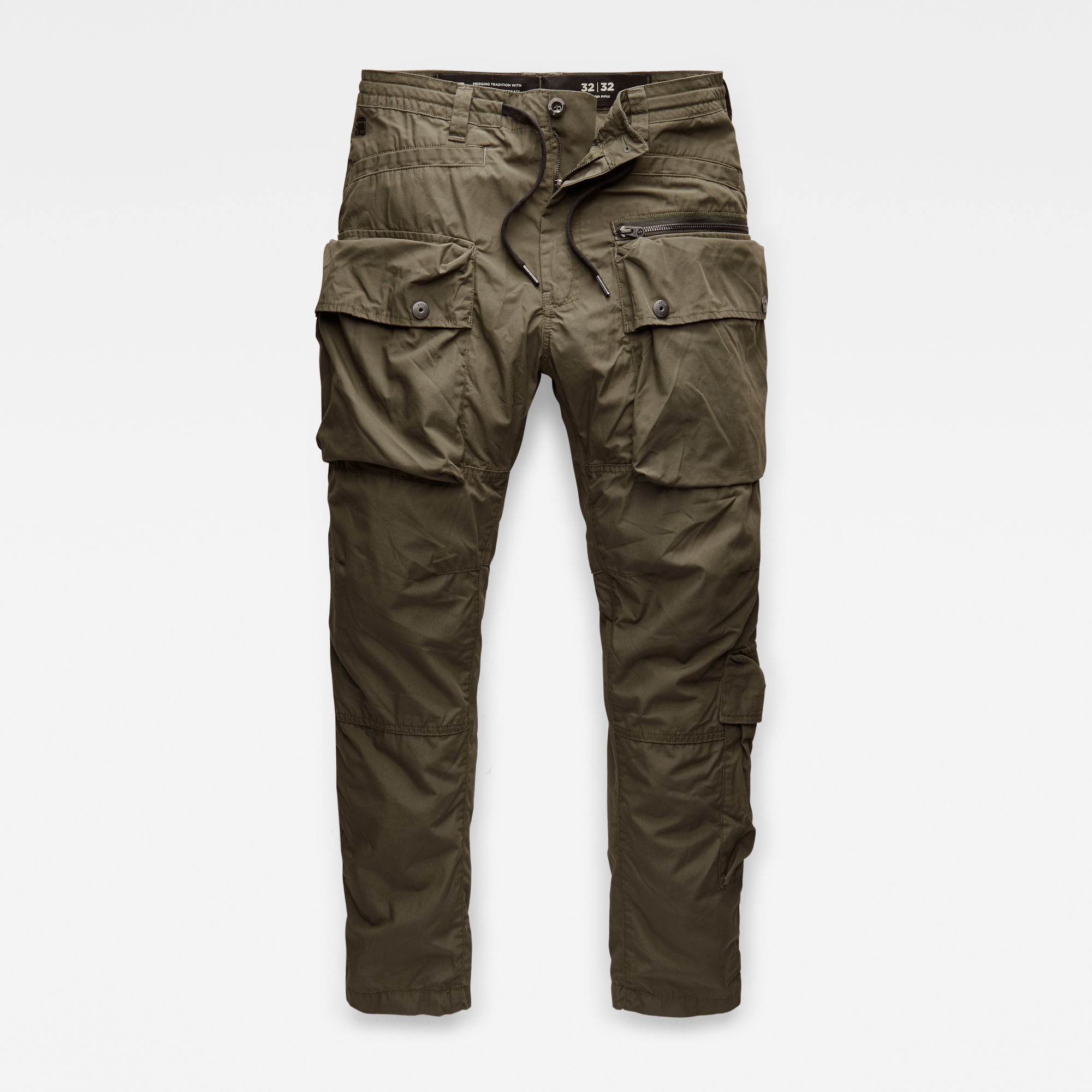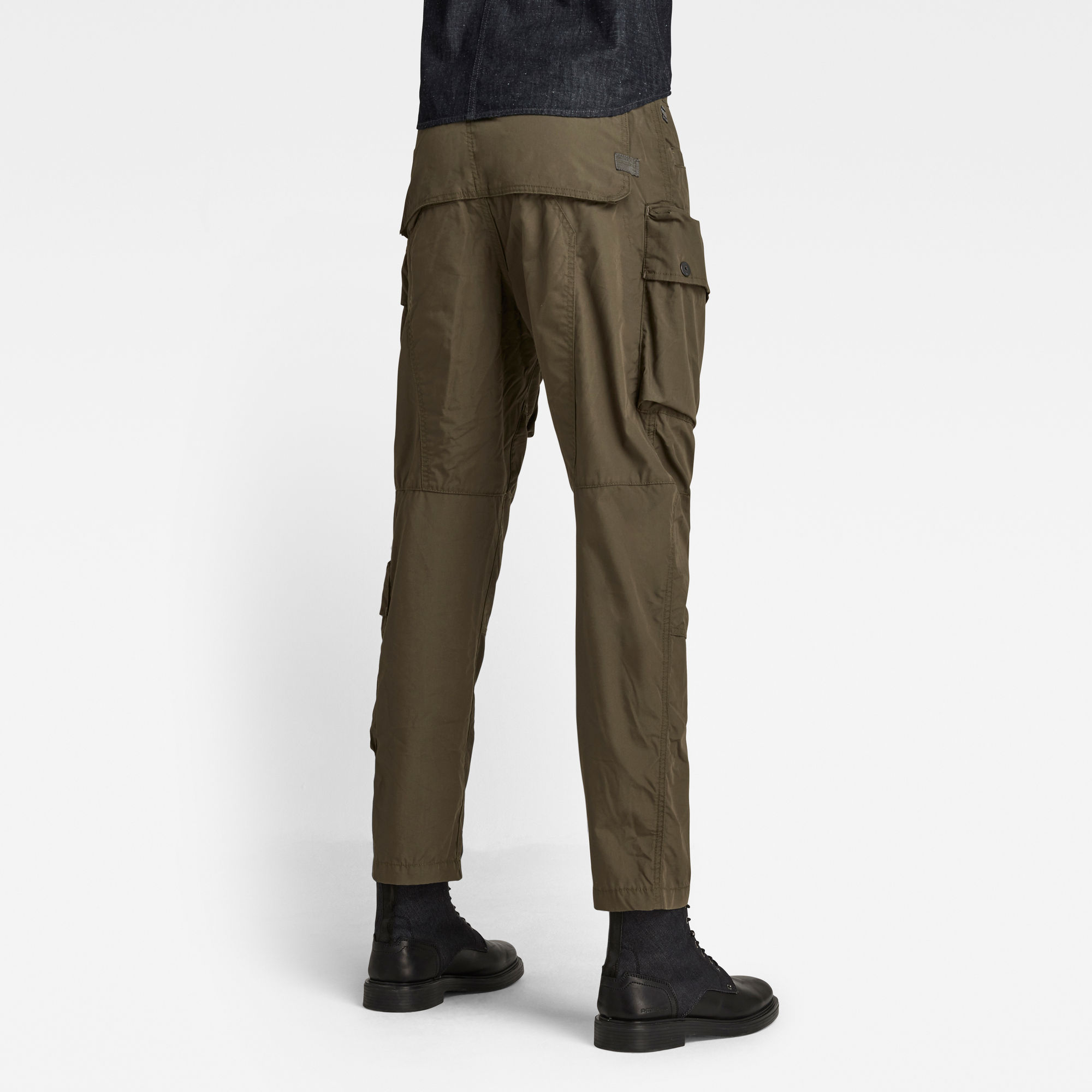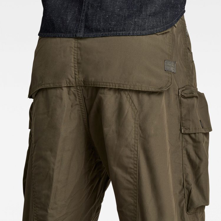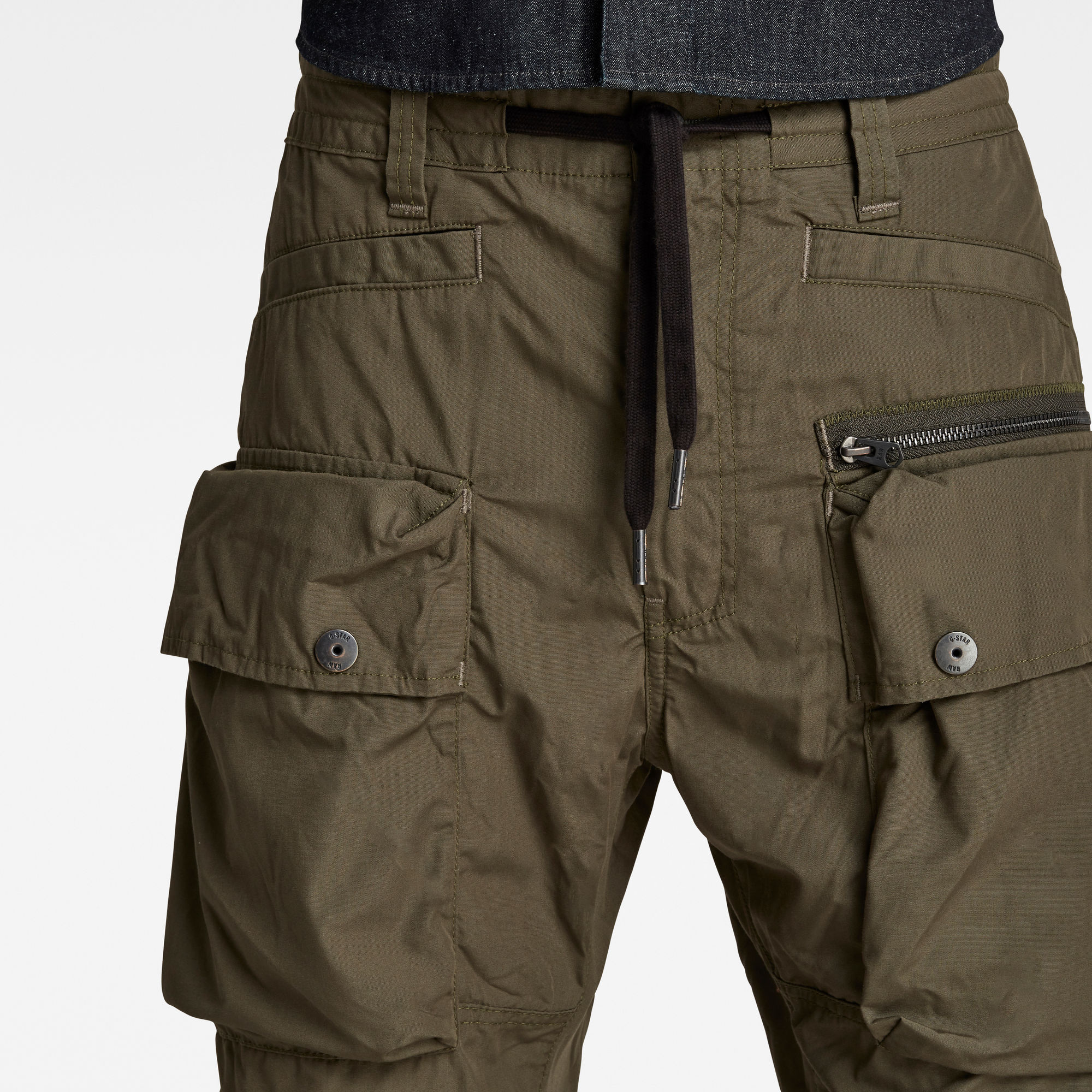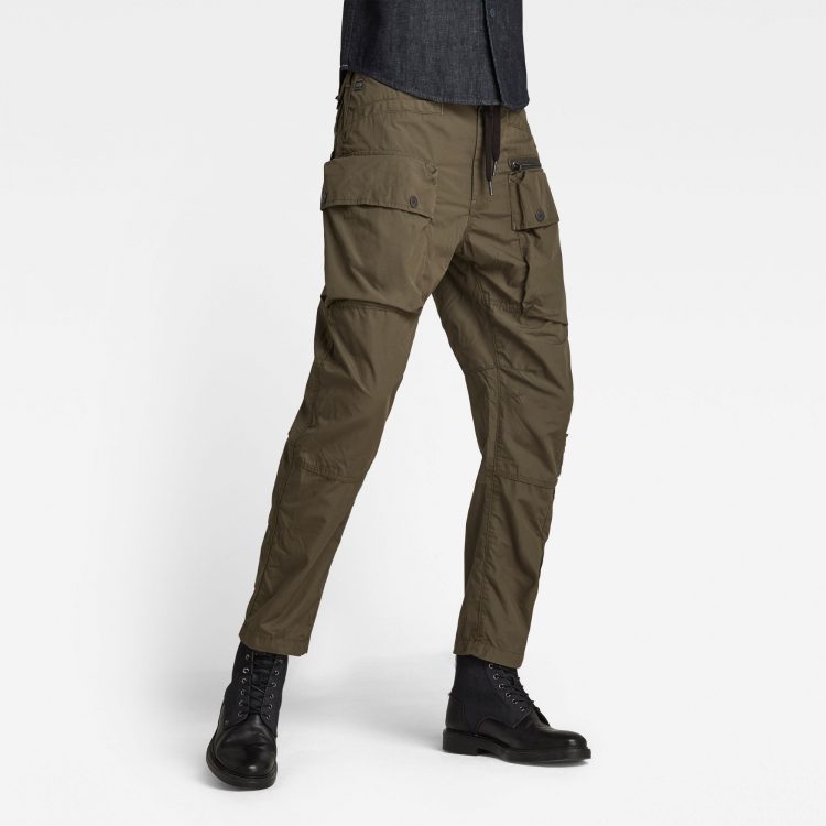 The waistband is adjustable by the integrated drawcord. These pants show single welt inset pockets, combined with roomy bellows pockets at the thigh. A zipper pocket is set behind one of them. Across the backside another pocket is created offering two compartments with snap closures. At the lower leg a slim pocket with a flap has a Velcro closure. When folding over the leghems a coated twill graphic print is visible at one side. Low waist-adjustable width,Roomy at the thigh, narrows down towards the ankle,Welt pockets at the front, thigh pockets, zip pocket set behind one of them, small pocket at the calf- Velcro closure,Roomy back pockets with a flap- snap closure,Zipper fly,Coated twill graphic label at the inside of one leg A lightweight fabric made from a combination of cotton and polyester, known from workwear fabrics. Poplin weave,Smooth, finely woven fabric,65% Polyester (Recycled), 35% Cotton,Recycled polyester is produced from post-consumer or post-industrial waste materials such as PET plastic bottles and apparel. Material that would otherwise have been sent to landfill or to incineration.,By giving discarded resources a new life we save raw materials, water, chemicals and energy. Preventing further extraction of a non-renewable resource.,By buying cotton products from G-Star RAW Raw, you're supporting more sustainable cotton farming.