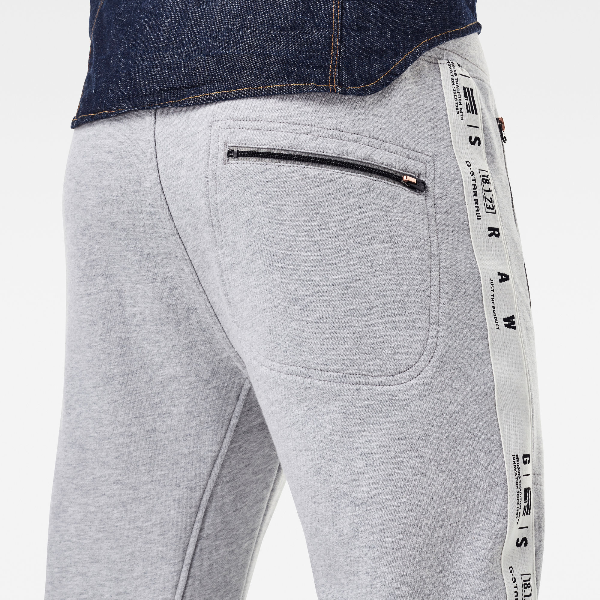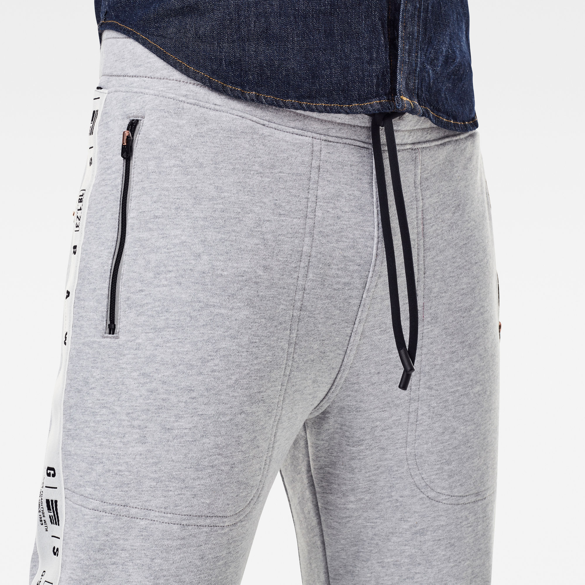 Zipper pockets are designed with a stitch down and placed at the waist and upper back. The side seams are covered with a branded woven tape. Mid waist,Elasticated waist- incorporated drawcord,Slim legs,Zip pockets stitched through at the waist and upper back,Woven GS RAW tape cover the side seam,Printed G-Star RAW logo at the hip This style is cut from a soft sweat fabric. The looped terry interior remains unbrushed. Soft knitted sweat fabric,Unbrushed, looped interior,60% Cotton, 40% Polyester (Recycled),By buying cotton products from G-Star RAW Raw, you're supporting more sustainable cotton farming.,Recycled polyester is produced from post-consumer or post-industrial waste materials such as PET plastic bottles and apparel. Material that would otherwise have been sent to landfill or to incineration.,By giving discarded resources a new life, we save raw materials, water, chemicals and energy. Preventing further extraction of a non-renewable resource.