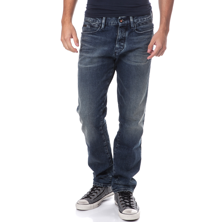 Βαμβακερό τζιν παντελόνι σε μπλε – μαύρη απόχρωση, με διακριτικά ξεβάμματα και τσέπες στο μπροστινό και πίσω μέρος. Εχει straight γραμμή.