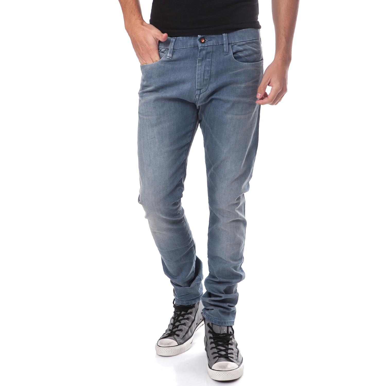 Βαμβακερό τζιν παντελόνι σε μπλε ανοιχτή απόχρωση, skinny γραμμή, έντονα ξεβάμματα και τσέπες.