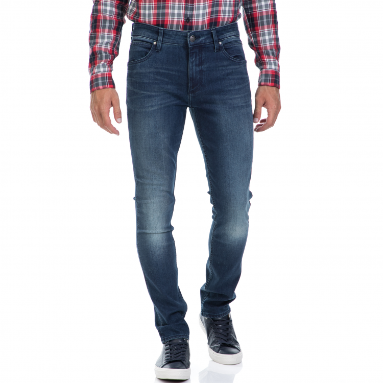 Βαμβακερό τζιν παντελόνι σε μπλε απόχρωση με ξεβάμματα, ίσια γραμμή, ελαστική εφαρμογή και τσέπες μπροστά και πίσω.