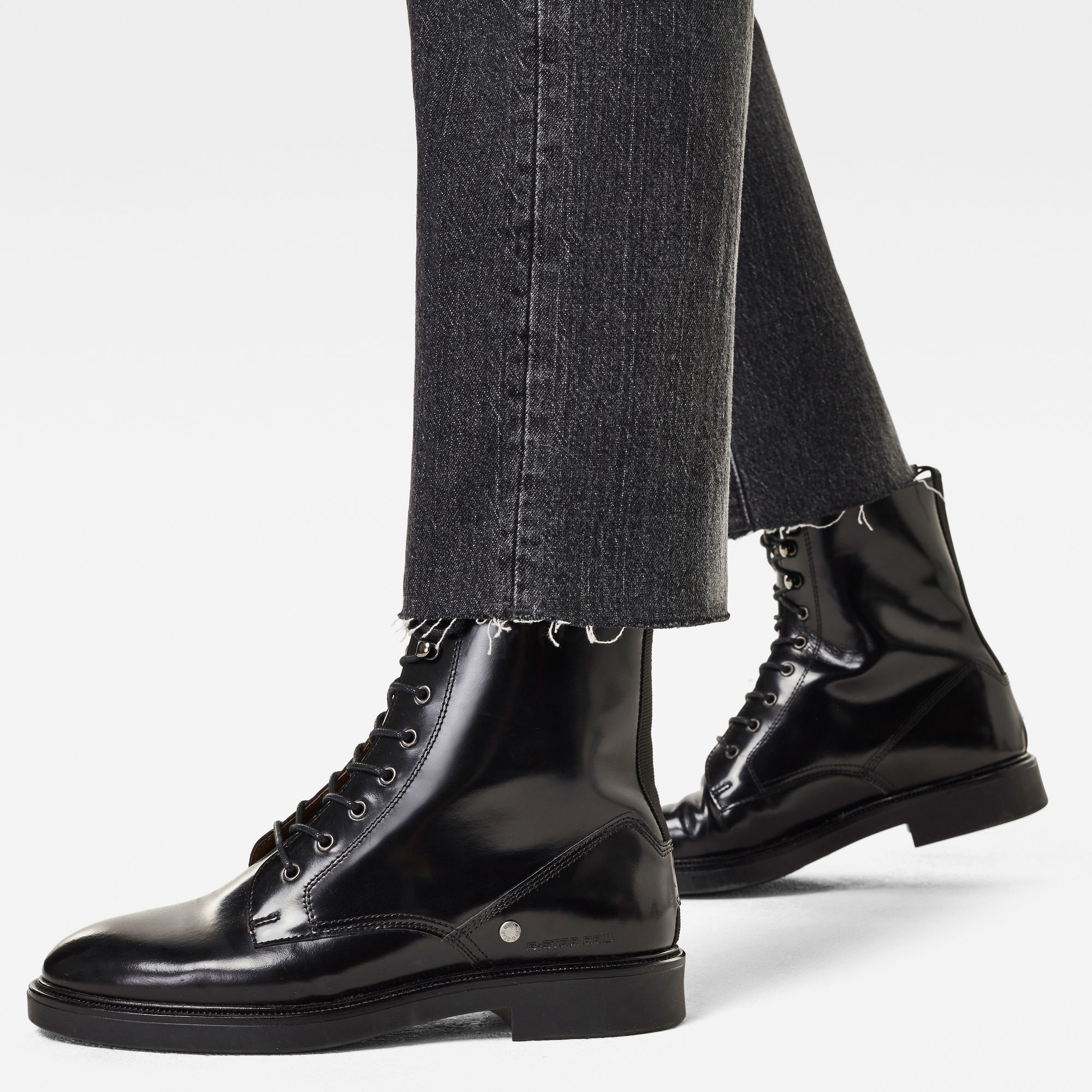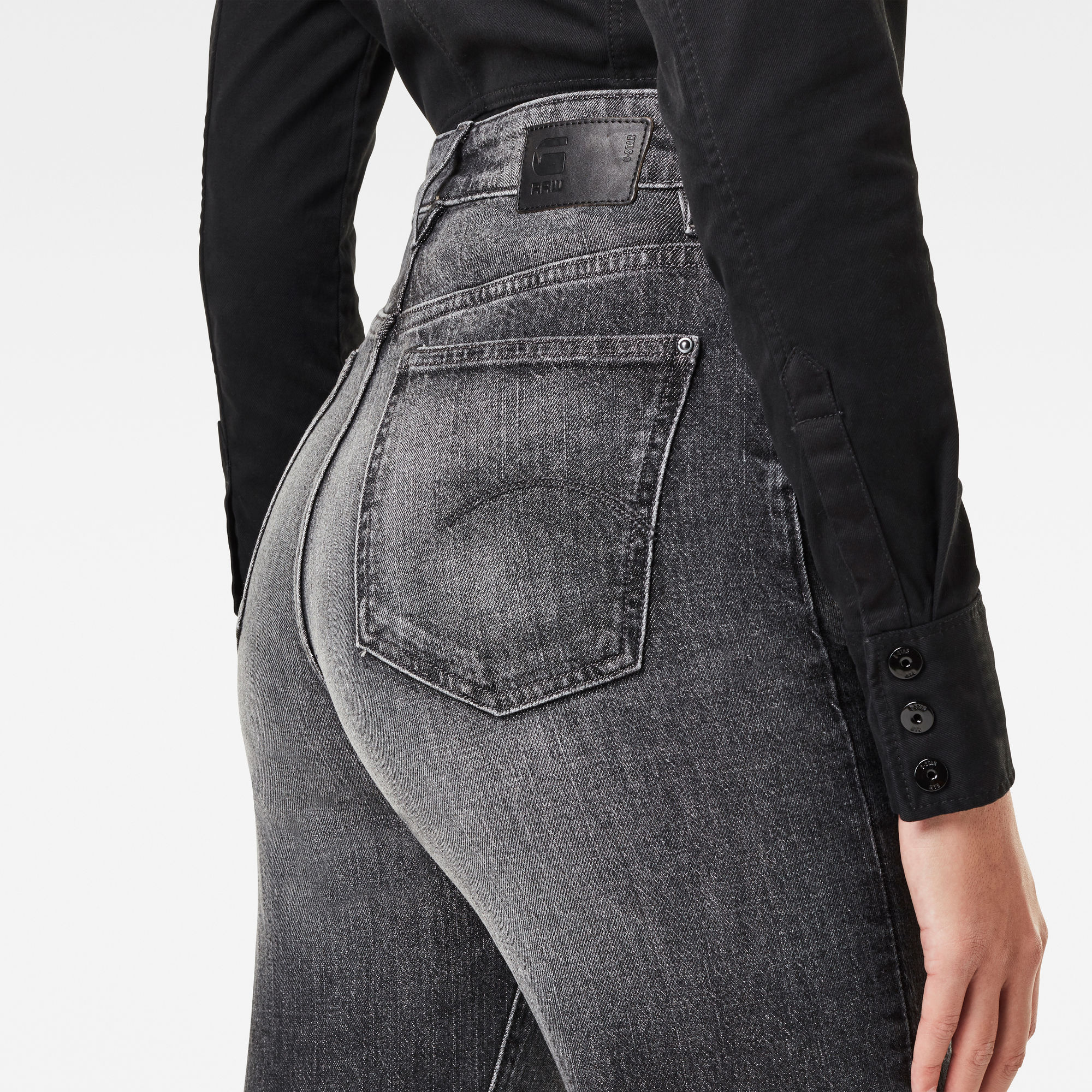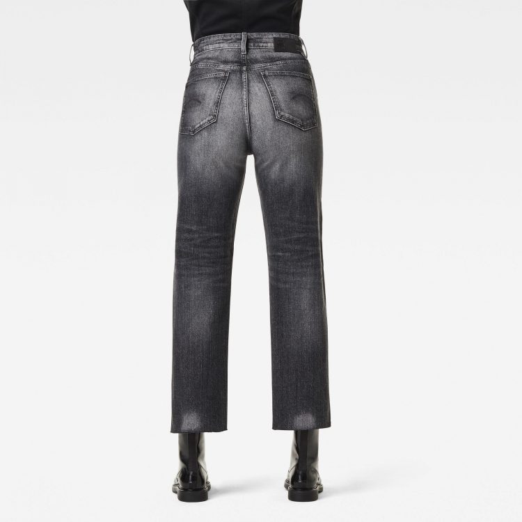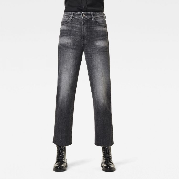 The legs are ankle high and offer a raw edge leg hem finish. Ultra high waist,Bold back pockets,Raw cut hem,Coin pocket set close to the waistband,Straight through the legs,Zip fly A 3×1 stretch black denim offering a rich texture surface. Added elastane creates a comfortable stretch. This style is dyed with sustainable black dyestuff from Archroma. Weight 12 oz stretch denim,3×1 Right hand twill construction,The black is derived from Archroma's sustainable dyestuff.,99% Cotton, 1% Elastane,By buying cotton products from G-Star RAW Raw, you're supporting more sustainable cotton farming.