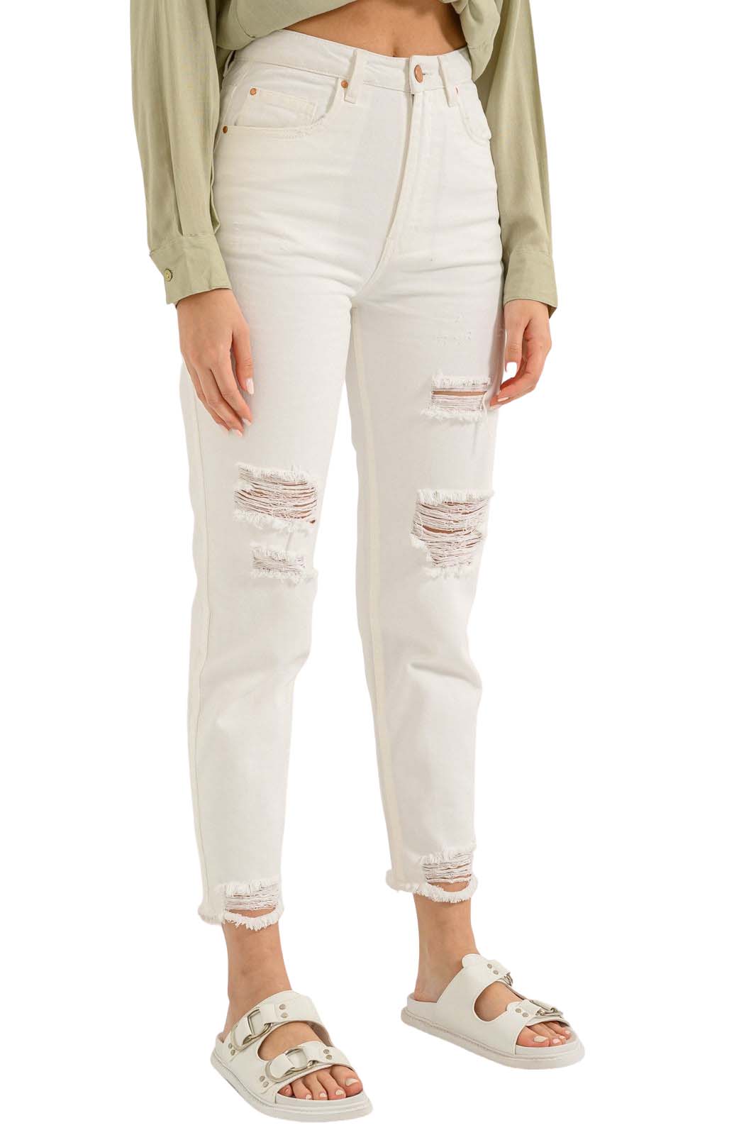 Ψηλόμεσο mom fit ντένιμ με θηλιές για ζώνη στη μέση σκισίματα στο μπροστινό μέρος και στο τελείωμα. Τσέπες στο μπροστινό και πίσω μέρος. Κλείσιμο μπροστά με κουμπί και φερμουάρ. Κανονική εφαρμογή. Μέγεθος μοντέλου: 36 Ύψος μοντέλου: 177cm