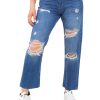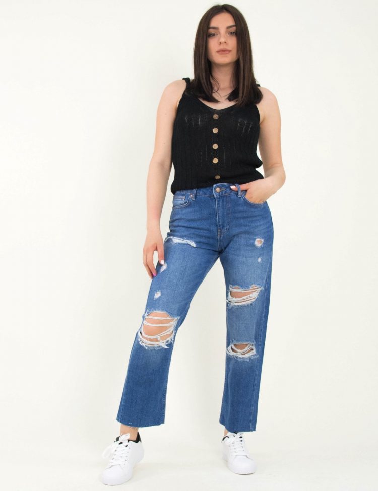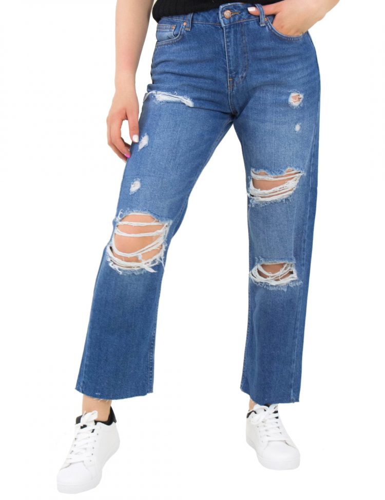 Γυναικείο ψηλόμεσο Straight Fit τζιν με έντονα σκισίματα και ξεβάμματα. Είναι πεντάτσεπο και κλείνει με κουμπί και φερμουάρ Κανονική προς στενή η εφαρμογή του Το υφασμά του σταθερό Σύνθεση: 100% cotton Το μοντέλο έχει ύψος 1,68 και βάρος 54 κιλά. Φοράει 27.