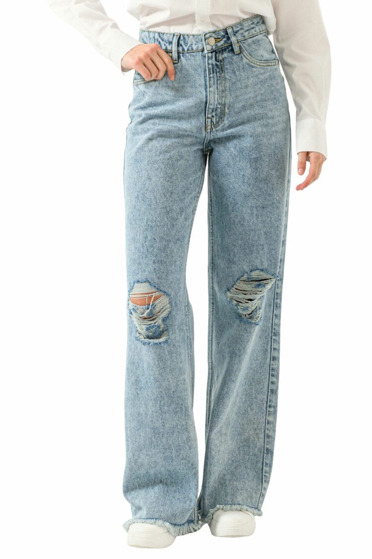 Ψηλόμεσο wide leg ντένιμ με σκισίματα στο μπροστινό μέρος ξέφτια στο τελείωμα και θηλιές για ζώνη στη μέση. Τσέπες στο μπροστινό και πίσω μέρος. Κλείσιμο μπροστά με κουμπί και φερμουάρ. Χαλαρή εφαρμογή. Μέγεθος μοντέλου: 36 Ύψος μοντέλου: 172cm