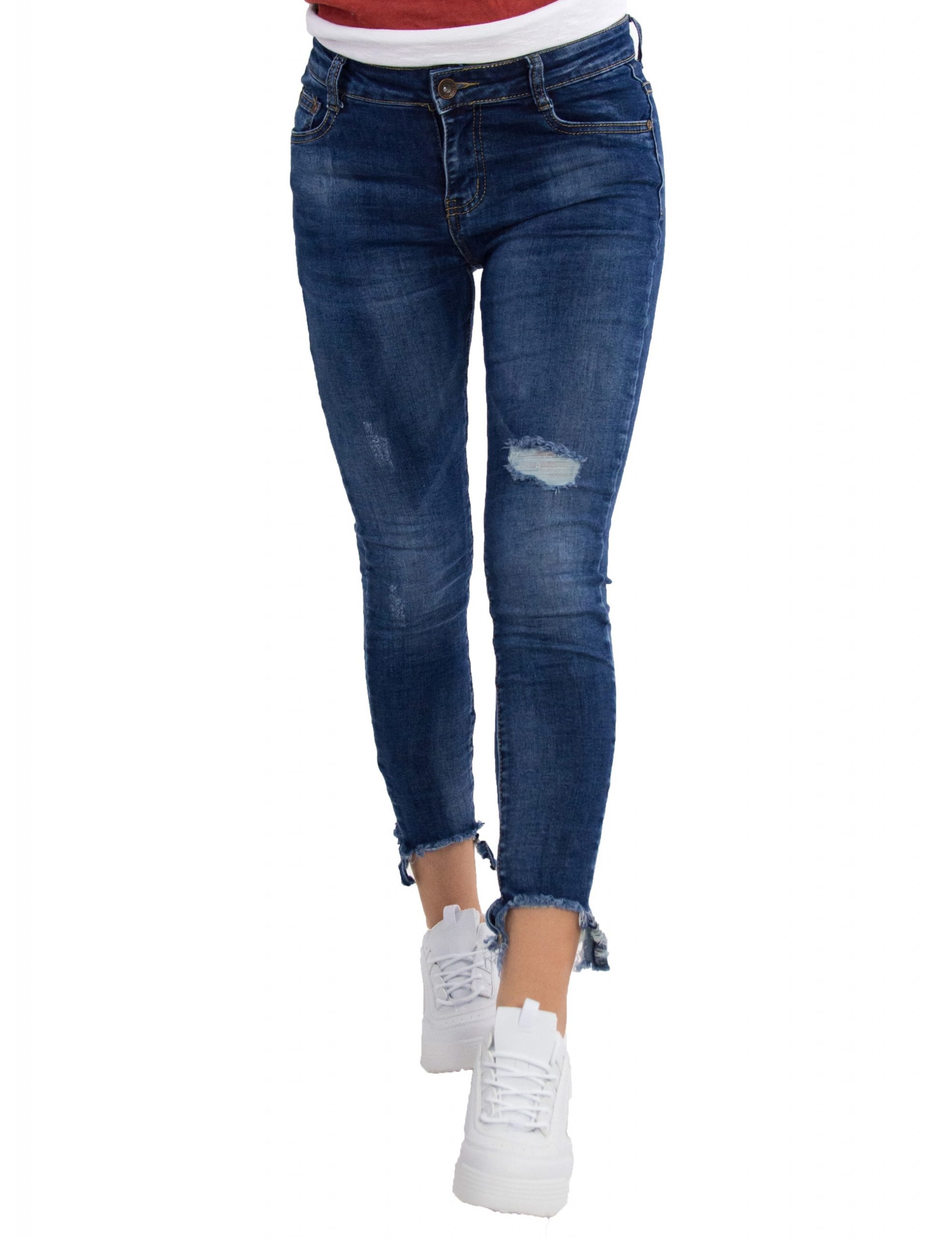 Γυναικείο τζιν παντελόνι σε μπλε ξεθωριασμένο χρώμα με ελαφριές φθορές. Είναι ψηλόμεσο και κλείνει με κουμπί και φερμουάρ. Στο τελειωμά του έχει ξέφτια και είναι σωλήνας Κανονική η εφαρμογή του Αρκετά ελαστικό το υφασμά του Σύνθεση: 67% cotton, 30% pol, 3% elast