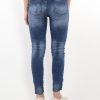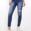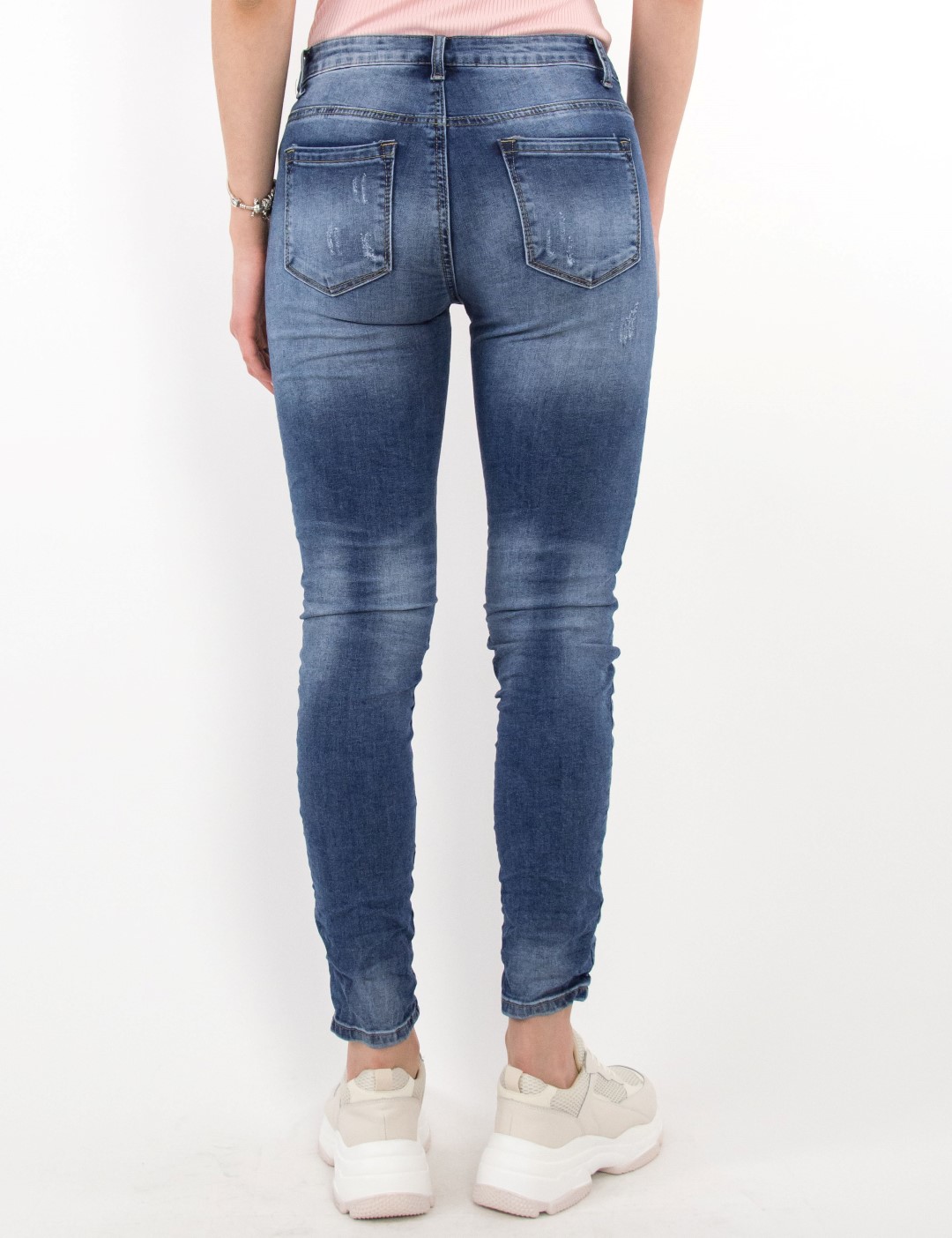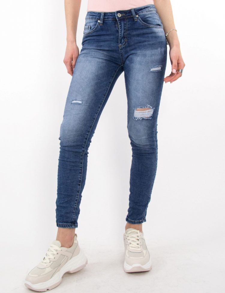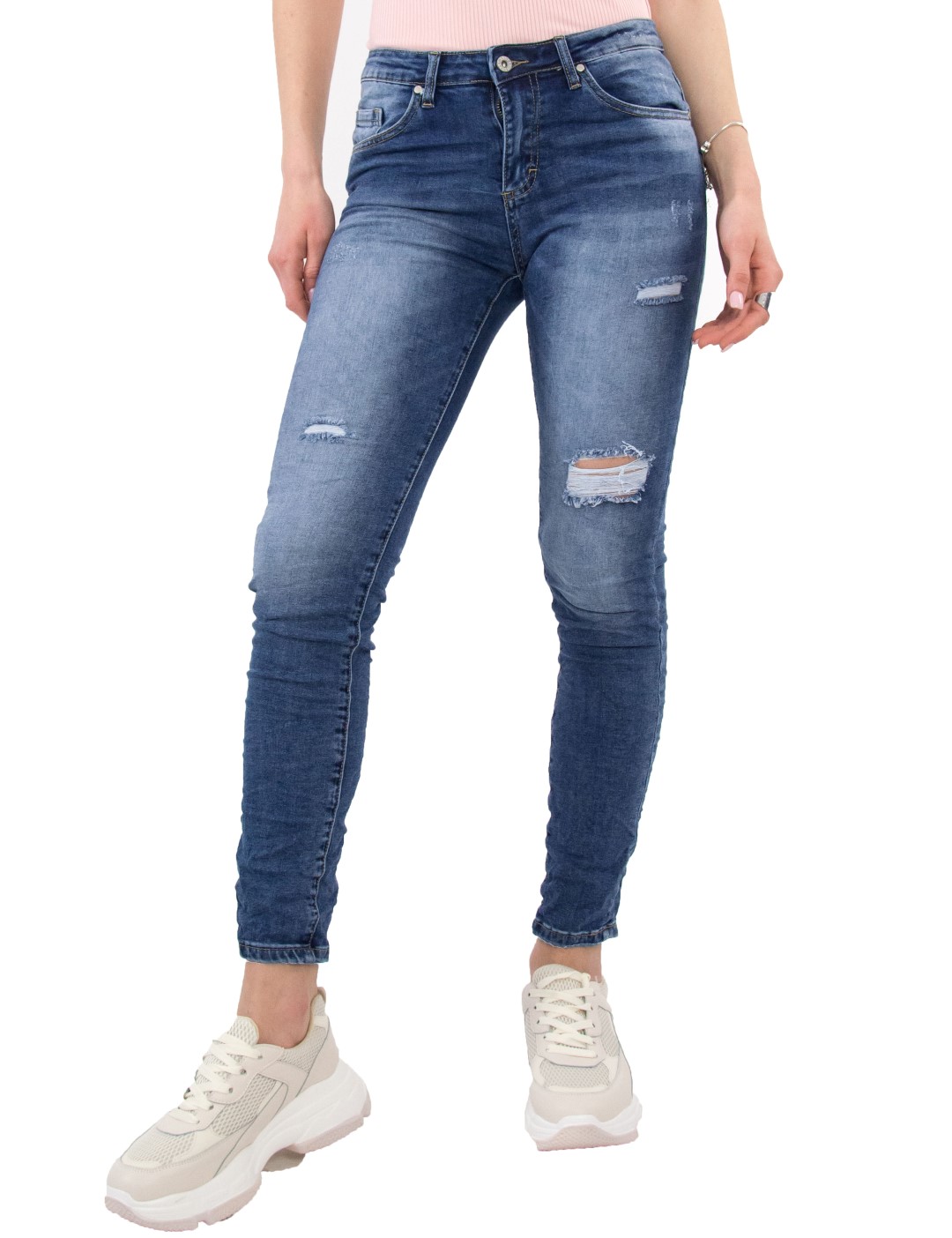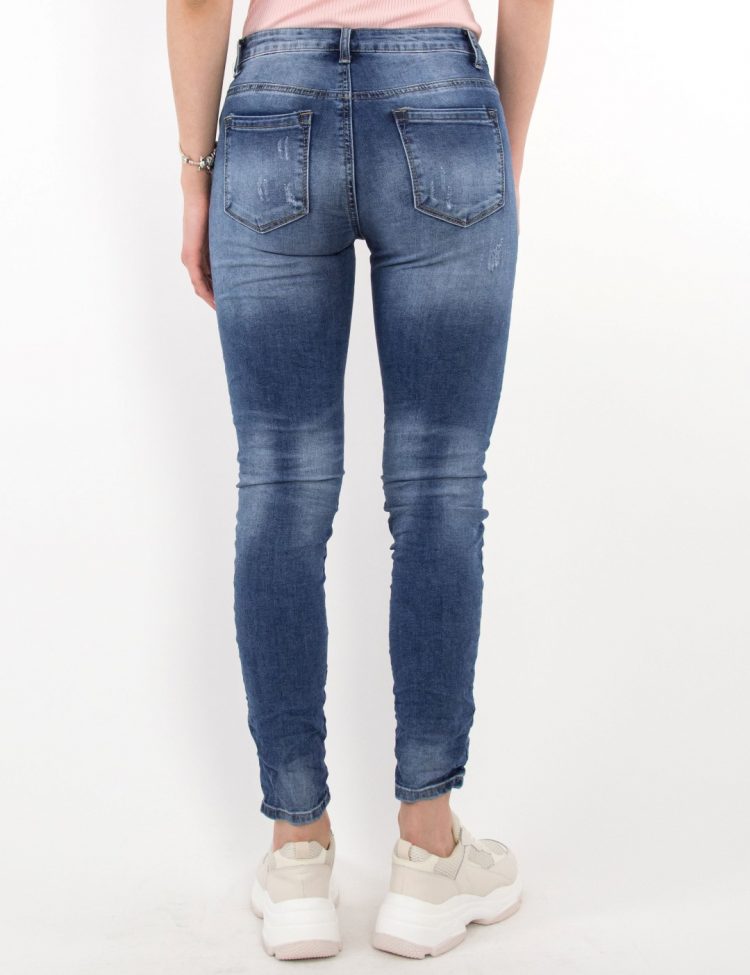 Γυναικείο μπλε τζιν ελαστικό παντελόνι. Είναι μεσοκάβαλο και κλείνει με κουμπί και φερμουάρ. Διαθέτει φθορές και ξεβάμματα. Το τελείωμα του είναι σωλήνας. Κανονική εφαρμογή Ελαστικό ύφασμα Σύνθεση: 91% cot, 8% pol, 1% el