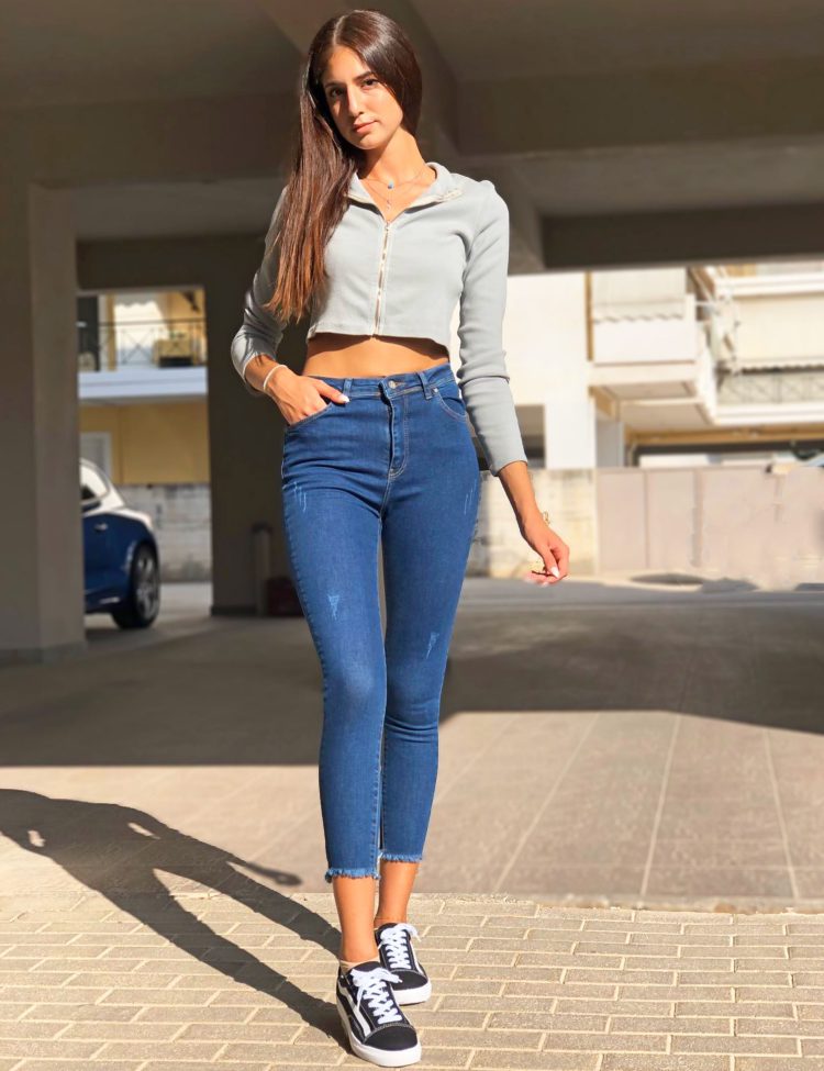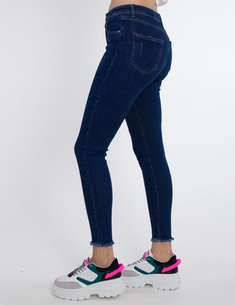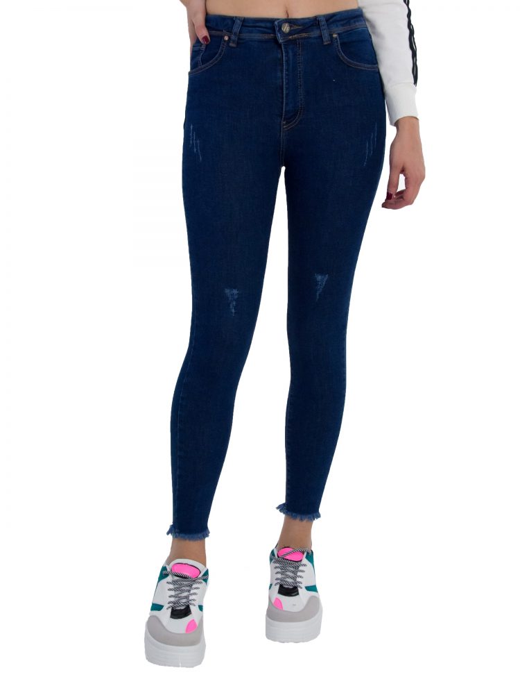 Γυναικείο ψηλόμεσο τζιν σε χρώμα μπλε κλασσικό με μικρές φθορές. Είναι πεντάτσεπο με θυλάκια για ζώνη. Κλείνει με κουμπί και φερμουάρ. Στο τελειωμά του είναι σωλήνας με ξέφτια και το υφασμά του είναι αρκετά ελαστικό Στενή η εφαρμογή του Σύνθεση: 98% cotton, 2% lycra Το μοντέλο έχει ύψος 1.75 και βάρος 55 κιλά. Φοράει μέγεθος 36
