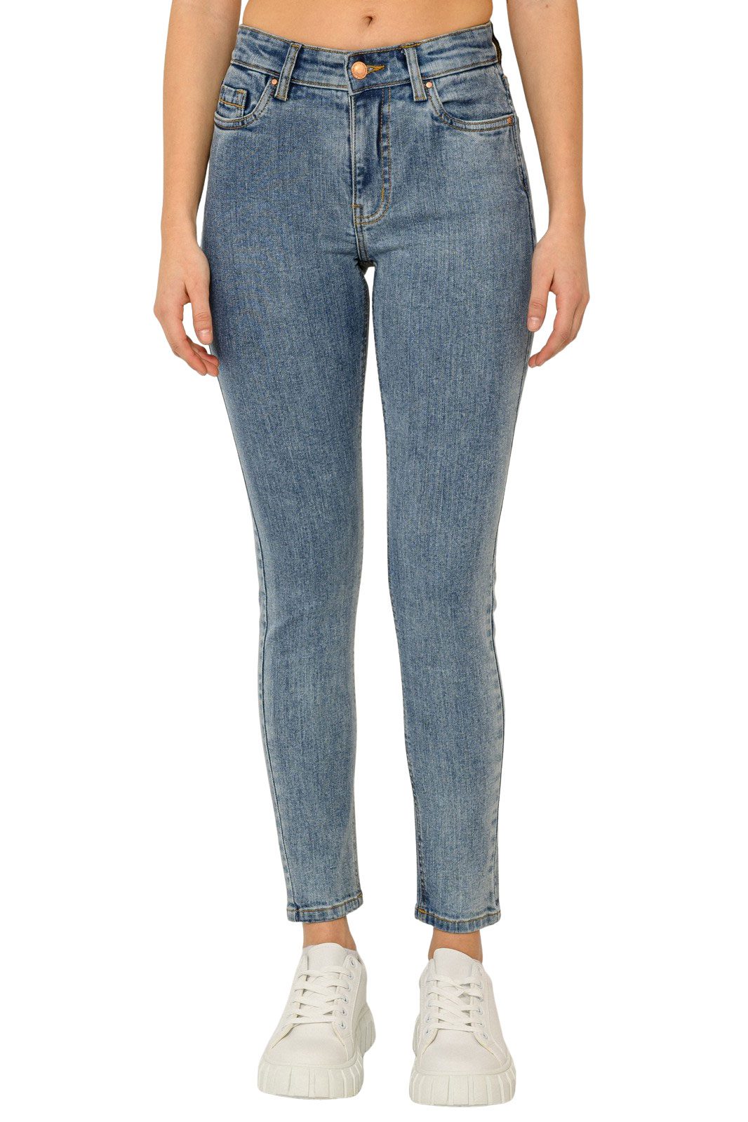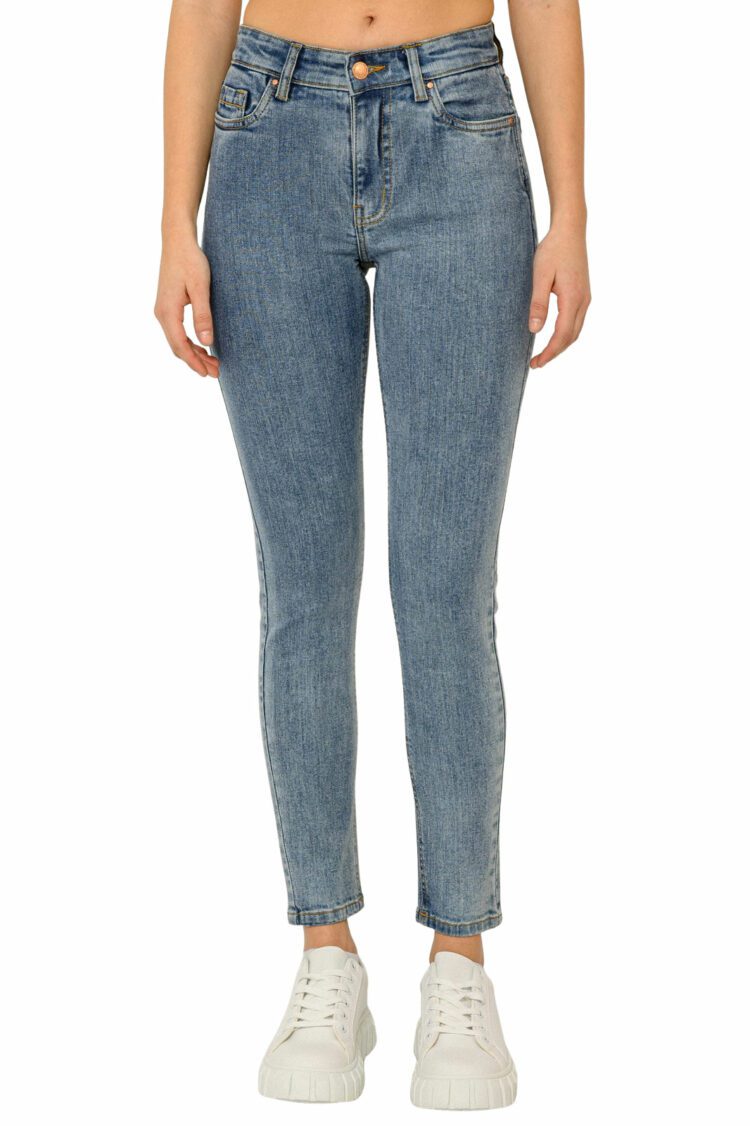 Skinny ντένιμ με κανονική μέση και θηλιές για ζώνη. Τσέπες στο μπροστινό και πίσω μέρος. Κλείσιμο μπροστά με κουμπί και φερμουάρ. Στενή εφαρμογή. Μέγεθος μοντέλου: 34 Ύψος μοντέλου: 172cm