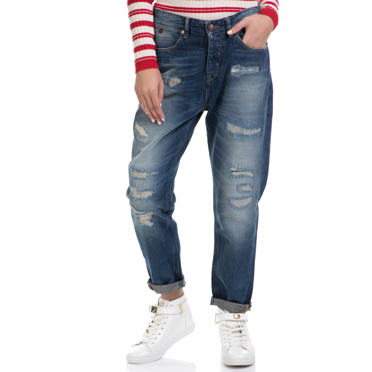 Γυναικείο βαμβακερό παντελόνι σε μπλε χρώμα, boyfriend γραμμή, σκισίματα και τσέπες μπροστά και πίσω. Ένα casual κομμάτι που δεν θα πρέπει να λείπει από τη συλλογή σας.