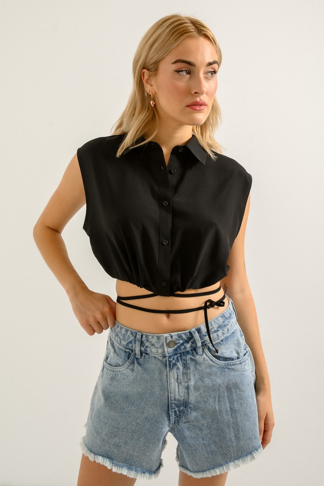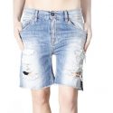 Ψηλόμεσο ντένιμ σορτς με θηλιές για ζώνη στη μέση και ξέφτια στο τελείωμα. Τσέπες στο μπροστινό και πίσω μέρος. Κλείσιμο μπροστά με κουμπί και φερμουάρ. Χαλαρή εφαρμογή. Μέγεθος μοντέλου: 34 Ύψος μοντέλου: 172cm