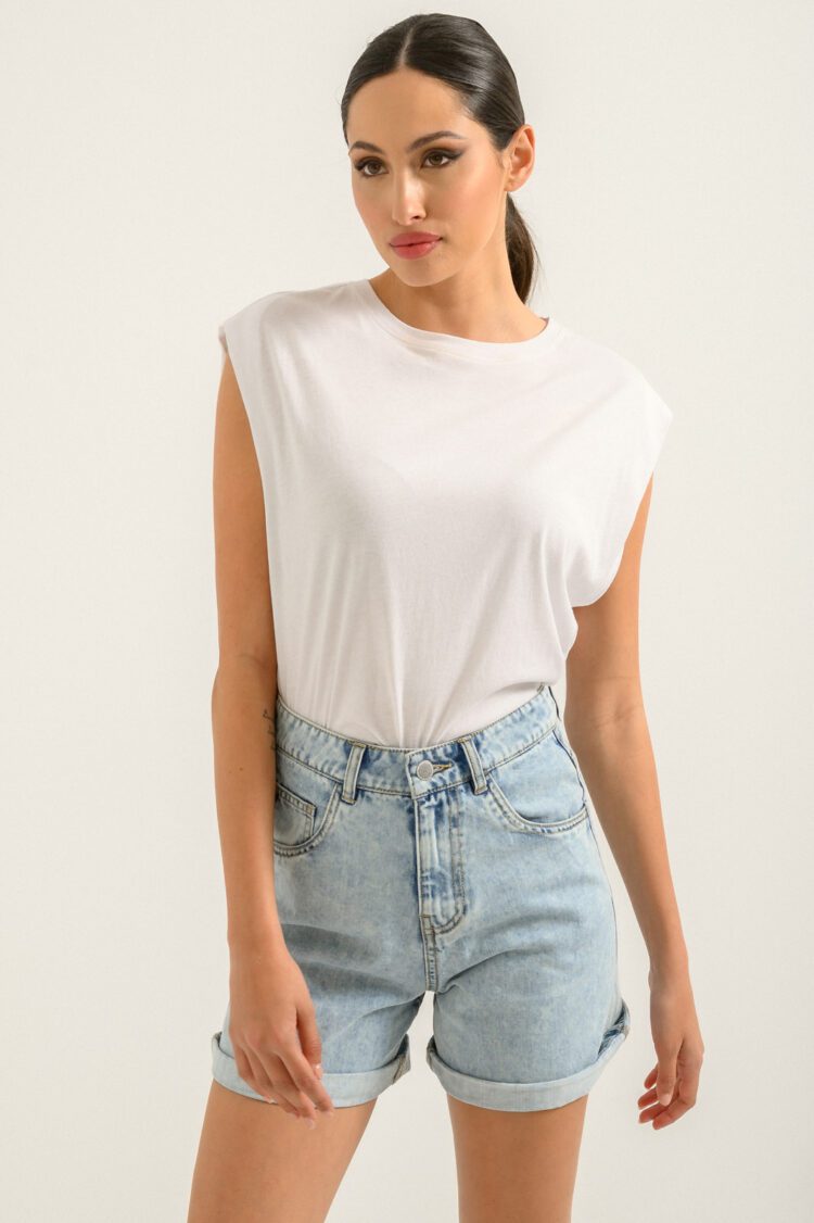 Ψηλόμεσο mom fit ντένιμ σορτς με θηλιές για ζώνη στη μέση. Τσέπες στο μπροστινό και πίσω μέρος. Κλείσιμο μπροστά με κουμπί και φερμουάρ. Κανονική εφαρμογή. Μέγεθος μοντέλου: 36 Ύψος μοντέλου: 173cm