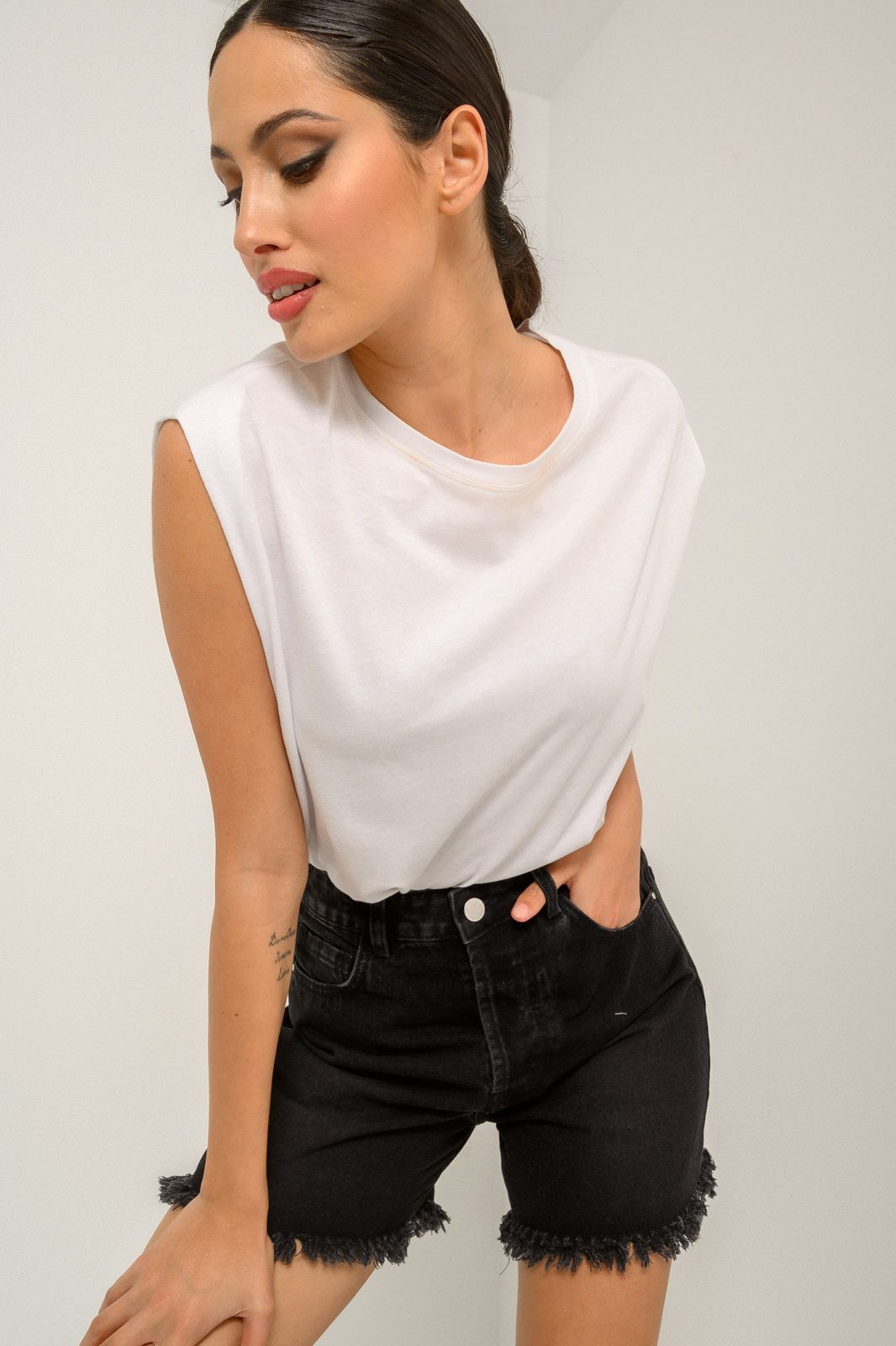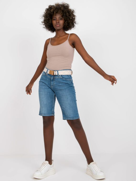 Ψηλόμεση ντένιμ βερμούδα σορτς με θηλιές για ζώνη στη μέση και ξέφτια στο τελείωμα. Τσέπες στο μπροστινό και πίσω μέρος. Κλείσιμο μπροστά με κουμπιά. Κανονική εφαρμογή. Μέγεθος μοντέλου: 36 Ύψος μοντέλου: 173cm