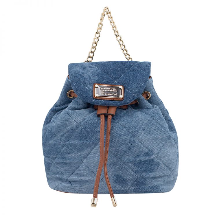 Σακίδιο από ύφασμα σε μπλε-τζην χρώμα. Κλείνει με καπάκι,έχει ρυθμιζόμενο λουρί , υφασμάτινη επένδυση με εσωτερική τσέπη και εξωτερική θήκες με καπάκι. . Μήκος 25εκ, πλάτος 25εκ, ύψος 12εκ.